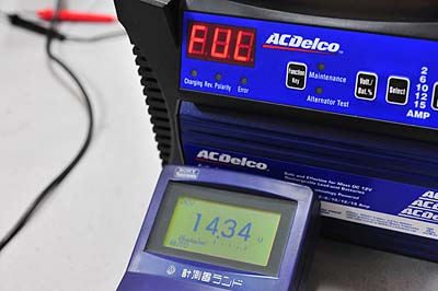 そして本充電が始まる。バッテリの状態や残容量にもよると思うが、12.5Vくらいから徐々に電圧が上がり、14.5Vくらいに達してそれを長時間維持。パルス波形は前出のモノとは違う。ちなみに通常の充電中は電動ファンは回らない。波形の高さは50mVくらい。