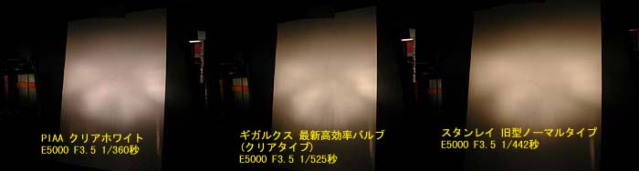 これらを白い紙にハイビーム照射して、その紙の表面をEOS-1の露出計で測定して明るさを比較。EOS-1の露出計が+−ゼロになる位置に合わせた時のシャッタ速度で明るさを判断する。シャッタ速度が倍の速さになったとしたら明るさは2倍って事になる。更にNikon E990のマニュアル露出で露出とホワイトバランスを固定して撮影して色と明るさを比べた。ロドスタについてるスタンレイのヘッドライトでバルブだけ交換して比較。ロドスタはエンジン始動状態でアイドルを1500回転に固定。ちなみにヘッドライト系のハーネス類はノーマルのままだ。