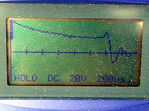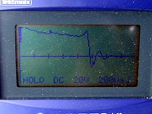 と、当サイトの実験でこんな月並みなインプレで終るわけが無い。ちゃんとデータも採った。先日のアース実験の時と同様に点火1次波形を観測した。1次側は2次側と磁束的に結合しているので2次側波形の変化はそのまま1次側に現れる。プラグを変えて要求電圧や放電時間が変化すれば、それはそのまま1次側に現れるハズだ。というわけで、アイドリングで1次波形を観測するのだ。