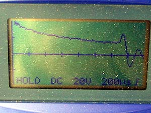 他の画像と同じアイドリング状態なのだが、要求電圧を上げると放電電圧が上がって放電時間が短くなるのがハッキリと解かる。横軸のスケールを変えたわけではない。放電時間は1msec以下まで短くなっているのだ。これ、どうやったかと言うと、プラグコードを半分引っこ抜いただけだ。プラグコードとプラグの頭の間にエアギャップを作ったわけ。つまりはプラグギャップを広げたのと同じだ。# アースでは差が出なくてもプラグを変えればこんだけ差が出るのだよ(笑)