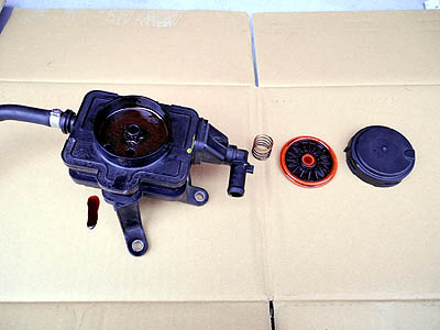 一定の負圧を保つように動作しているじゃないか! なんという高度なシステム。すげぇ。マニ側からダイレクトに吸わせても一定以上の負圧になるとダイヤフラムで吸入口が閉じて遮断、ブローバイ圧力が上がるとダイヤフラムを押し退けてポートが開いて負圧側に引かれる、これを高速動作して負圧を維持する構造。