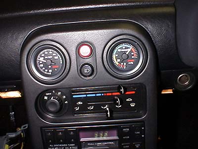 2011.11.28追記 現在は負圧計を残して他は取り外しました。 メータパネル内に内蔵する ど〜だマルチメータを使用中です。メータパネル自体は今は亡き出羽氏との共作であるVer Maruaymaメータを使用中です。 私のロドスタに付いている追加メーターは以下のモノです。 これは東名のA/Fメーター。サイズはΦ60mm。 左側が大盛りの電子式油温計。右側が大盛りの機械式負圧計。どちらもΦ52mm。 エアコンは付いてないので吹き出し口君には死んでもらった(笑)。