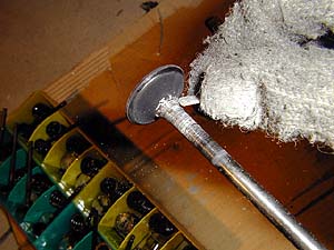 ドリルにチャッキングして回転させ、特製のハイスピードスチール製バイト(単なる金ノコの刃を削って作ったモノ(^^; )を使ってカーボンを落とす。更にサンドペーパーを当てれば綺麗になるのだが、時間が無いので400番で軽く磨いただけ。