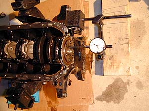 クランクシャフトのエンドプレーを測定。 どうやって測るのかわかんないから、とりあえずダイヤルゲージを貼り付けて測った(^^;。これも問題無し。