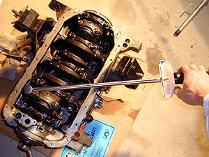 プラスチゲージをメタルに挟んでから、規定トルクで締め付ける。KTCのプレート型トルクレンチである。プリセット式よりも狂いが少ないしシンプルで信頼性が高い。私はエンジンを組む時はコレを愛用している。
