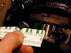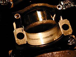 再びベアリングキャップを外し、プラスチゲージが潰れた幅でクリアランスを測定する。ゲージの読みは約0.05mmだ。 え? それって広いんじゃぁ...(^^;;;