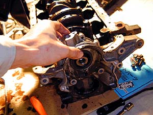 邪魔なオイルポンプASSYを取り外す。これは簡単に外れる。これが外れたらジャーナルのボルトを外せばジャーナルメタルが見える。