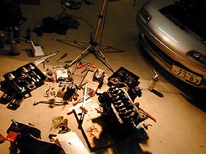 こんな状況でバラしてた。なんて乱雑なんでしょう(^^;。もちろんバラした部品は片付けてその後の作業時にはもっと整理された状態でやっているけどね。 5本足のスタンドは500Wのハロゲン投光器である。これが明るいし暖かいのだ。