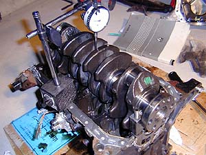 クランクシャフト曲がりを測定中。アストロで買ったダイヤルゲージとシックネスゲージは大活躍である(笑)。 No1とNo5のベアリングキャップを逆さまにして置いて、その上でクランクを回転させている(正しくはVブロックでやるのカモ?)。そして真ん中のNo3のジャーナル部分での振れ幅を測定するわけ。この振れ幅の1/2がクランクの曲がりとなる。