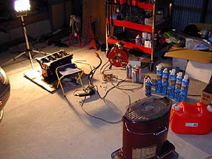 事故発生現場。事故直後にブロックを再び元の位置に戻した状態である。ストーブとブロックの位置関係はこんなモンだったわけで、かなり巨大な炎が出現した事になる。ストーブのとなりに灯油のポリタンが有るが、中身は空。あぶねーなー。教訓: 「ブレーキクリーナには気を付けよう」