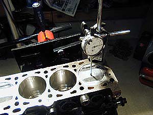 ピストン側の燃焼室容積を測定する。B6はピストンがシリンダより突き出してるのでそのままでは容積を測定出来ない。ダイヤルゲージをセットして2mmだけ下げて、アクリル板を当ててオイルが何cc入るかを測定する。のちに2mm下げた分をマイナスすればピストンヘッドの容積が出る。オイルを注入しているところは写真を撮る余裕が無かった(^^;。容積のバラツキは最大で0.5ccだった。測定誤差も有るので無視しても良い値かもしれない。シリンダヘッド側の容積と合わせて1ccを超えるバラツキが有ったら修正する。
