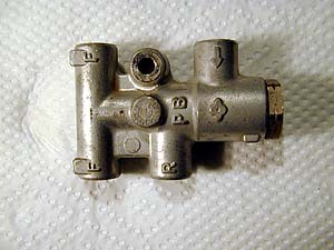 これがプロポーショニングバルブ、通称Pバルブ(ぴぃ〜ばるぶと読む)である。 フロントの油圧に対してリヤの油圧を下げる働きがある。これによってリヤのロックを防いでいるわけ。って事は、こいつを調整すればブレーキバランスを変更できるのである。