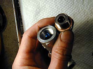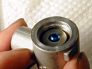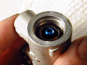 Pバルブ内部にはピストンが有る。ブルーアルマイトになってるのがピストン。このピストンの動きを妨げないようなワッシャを選択しなければならない。