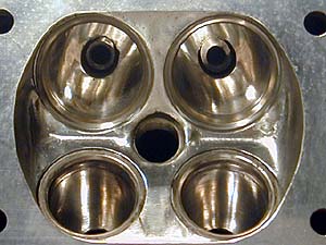 ピッカピカの燃焼室とポート。両脇の一部は磨きが甘いが、燃焼室容積合わせの時に削る予定の部分である。左上のバルブガイドは抜けてきてしまって打ち換えたモノ。3mmほど短いモノを使ったのでガイドが削れていないが、ポートへの突き出しは無い。
