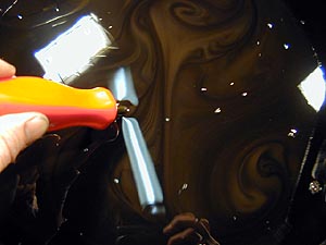 エンジンオイルはメタルパウダーがタップリと混じったパールカラーのような色。かき回すとグルグルと回るオイルに模様が出る。こんなオイルは新車時のナラシ運転以来。オイルには細かな摩耗粉は多数混じっていたが、大きな破片や切り粉などは無かった。オイルエレメントも交換して、オイルエレメントのチェックバルブを押して中のオイルを出してみた。細かな摩耗粉がたくさん出てきたが、やはり大き目のモノは無かった。新車のナラシの時は巨大な切り粉が大量に出てきたのだが、やはりそれとは違う。とはいえ、普段のオイル交換に比べれば大き目な金属片と言える。ちなみに新車時にメタルパウダーが減って正常な色のオイルが出てくるようになったのは3000kmくらい走った時だった。切り粉が無くなったのは1000Kmくらいの頃。新車ナラシの時は廃油に混じっているメタルパウダーは金属片の量でナラシの進行具合を判断してた。今回も1000Kmくらい走った時点でのオイルを見てナラシの塩梅を判断する事にしよう。