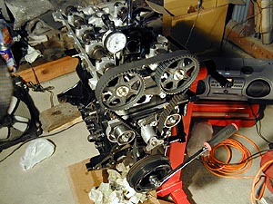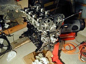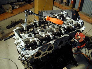ヘッドボルトを規定トルクいっぱいで締め付け、HLAを入れたらカムシャフトを載せる。O/HしたHLAはなんだかいつもと違う。やっぱしO/Hすると気分が良い...ってそうじゃなくて、カムがなんだか浮き上がってます。HLAが伸びてるのでカムが浮いちゃう。まぁ、ベアリングキャップを締め付ければHLAが縮んで丁度良くなるだろう...。と、思ったら、ベアリングキャップを締め付けたらバルブが全部一緒に開きました...(^^;;;;;;;;;。俗に言うバルブ突き上げ状態。なんてこった。HLAが素晴らしすぎて縮んでくれない。まぁ良いか、カムを回してバルブを最大リフトにすれば縮んでくれるだろう。ピストンに当たらない様にクランク角を90度くらいにしておいてカムをグルグルと回す...が、回ってくれない。なんで? なんと、バルブスプリングが縮みきって線間密着しちゃってる。それでもHLAが縮んでくれない。チェックボールの密着具合がよほど素晴らしいと見た! って喜んでる場合ではない。どうする? とりあえずカムを無理矢理回す。なんとか回ってくれたのだが、やっぱしバルブは閉じない。予期せぬエラー。バルブ最大リフトの位置でカムを止めておいて、バルブが閉じて行くかどうかを観察した...閉じない。本来ならバルブが閉じてる筈の時に2〜3mmほど開いてる。これじゃ絶対にエンジンは始動しない。突き上げてます。ラッシュアジャスタ付きのエンジンでバルブ突き上げに悩むとは夢にも思わなかった。