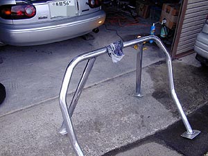 んで、ど〜だバーを付けて、ロールバーを付ける時になってから、ブレイスバーが邪魔な事に気付くと...(^^;。今思えばブレイスバーを止めているナットを溶接しておけば良かったなと...。すでに遅し。次にど〜だバーを外す機会が有ったらナットを溶接して置こう。