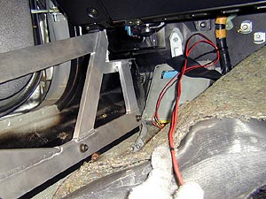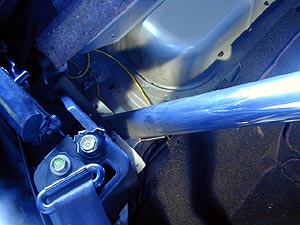 ど〜だバーの前側の取付け部。コーナ部分の補強に沿うようになっている。これが高剛性の秘訣でもある。フロントウインドの振れが無くなるのはこの辺りの設計の巧さがポイントだろう。エボモデルの強力さも解かるだろう。ECUの下から生えてる配線は、計測器などを接続しやすいように引き出したモノ。