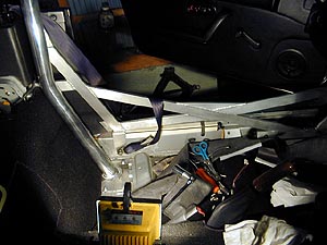 ここで問題発生。1800純正のブレイスバーにブチ当たってロールバーが入らない。ブレイスバーを外さなきゃならん。...んが、ブレイスバーは裏からナット掛けで止めてある。ナットを押さえるにはシートベルトリトラクタを外さなきゃ。って事は内張りを剥がなきゃ。って事はど〜だバーを外さなきゃ。え?(^^;いやだぁぁぁぁぁぁぁぁぁぁぁぁぁぁ〜っ!