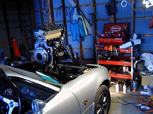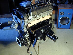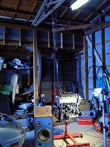 チェーンブロックで釣り上げてエンジンスタンドを外す。ブラケットを外したらエンジンサポートを付けて、いよいよクルマに積み込むのだ。