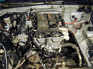 エンジンを一旦高く持ち上げて、クルマを押して動かし、位置を合わせる。ジャッキをミッションにかけてミッションの高さを調節しておいてエンジンを下げて行く。Fire号はA/CとかP/Sといった余計なモノが無いので簡単。んが、問題発生。クランク角センサがバルクヘッドに干渉してうまくいかない。降ろす時はヘッドだけ先に降ろしてあったから簡単だったんだけど、ヘッドと一緒だとクランク核センサがブチ当たる。結局、クランク核センサを外した。わんだぁあぐり君のクラッチガイドで合わせたクラッチセンタはピッタリで、クラセンを外したらスコンっとハマった。あとはエンジンサポートの位置をうまく合わせてチェーンブロックを下げれば良い。エンジンとミッションを止めているボルトを締めて、スタータモータを付ける。このスタータのネジ3本が一番やり辛い。2本は15度オフセットのメガネかコンビレンチで上から締められるが、クラッチホースのステーを共締めにしているボルトだけは上から締められない。降ろす時はヘッドが無かったから比較的簡単だったけど、ヘッドが載った状態では困難極まる。結局、下から必殺のSnap-onエクステンションバー4連装でずぅ〜っと後ろの方から締め付けた。この技を使うと簡単に締め付け出来ますね。200mm+200mm+150mm+75mmのウォブルエクステンションで締め付けた。