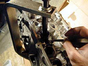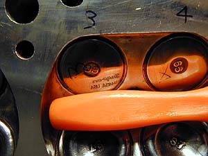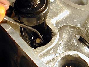 ピンセットで運んでピックで押し付ける。するとグリスの効果で張り付くので、そのままそっとバルブスプリングコンプレッサを緩めればOK。実際にはピンセットで送るのとピックで押し付けのは同時作業なのだが、写真を撮ったら手しか写らなかったので2枚の写真に分けた。人はどうやってやってるか知らんが、私はいつもこうやって組んでる(^^;。これを16回繰り返す。
