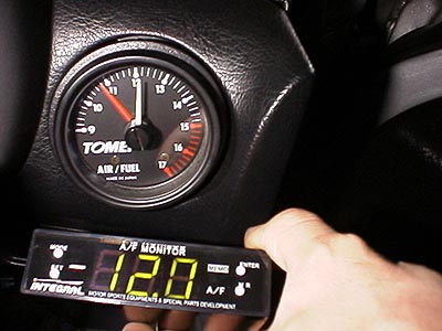 東名のモノは 10.8 付近を指している。インテグラルはご覧のように 12.0 である。あぁ、なんてトンチンカンなんだろう(笑)。これは空ぶかし5500回転でアクセルを固定した状態。フィードバックから抜けているので高負荷増量マップによる増量補正が掛かっている状態だ。この状態でインテグラルのモノはピッタリと数値が固定して動かないのだが、東名のモノはセンサの温度上昇に伴って徐々に薄い方向に動いていく。撮影直前には10.0程度を挿していたのだが、撮影中にもどんどん薄い方向にズレてくる。常に動いているので結局空燃比が幾つなのかはまったく解からない。これじゃ何の役にも立たないのだ。