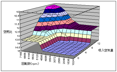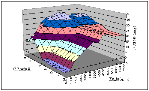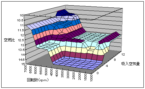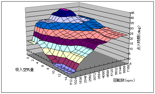 ではNA8Cの燃料マップと点火時期マップを見てみましょう。16進数を実際の点火時期や空燃比に変換する数式はNA6CEの数式をそのまま流用しました。なんとなくそのまま使えそうな気がします。という事で無責任モードで作ったグラフですのでそのつもりで見てください (^^;;;;;。