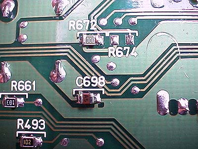 この「R672」の抵抗がミソなんです。実は0Ωの抵抗なんです。つまりただのジャンパーなんですね。32ピンのECUはこの抵抗が付いてません。そのまま28ピン256bitのROMを突き刺すと256bitを超えるアドレス領域を読み出そうとしてしまいます。そこでこのR672の場所をショートさせてしまえば256bitの領域以外は読みません。実際に加工した32ピンタイプのECUの基板を以下に載せます。