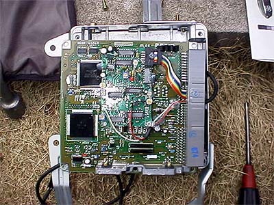 げげげのげ。可変抵抗がいっぱい付いてるあたりがすっごく怪しいっす。ROMらしき物は付いてませんね。どこでデータを書き換えてるんでしょうか? 可変抵抗で各種センサーからの入力信号を変化させてるだけのような気がするんですけど...。例えばエアフロ、水温センサー、吸気温度センサーなどの信号に割り込んで燃料を増減量してるとか。どう考えてもマップを書き換えているようには見えませんね。またしても恐るべきショップチューンの実態が暴かれました。このECUとノーマルECUを複数の車両で付け替えて走ってみたところどの車でもノーマルとチューンドでの違いがほとんど分からなかった。気のせいみたいなレベルの違いだそうだ。目隠しテストならまったく違いが解からないかもしれませんね。こんなモノが10万円以上もするのかぁ〜。しかもデータ書換えは有料だそうで。データ書換えって可変抵抗を回すんでしょうかね?(爆笑)