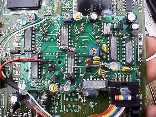 むむむむ? CPUみたいなヤツが2個も付いてますね。ツインプロセッサーでしょうか?OSはWinNTかな?(笑) 真ん中に安っぽい基板が追加されてます。基板の上にエイリアンのよだれみたいなのが垂れていて実に汚いです。その安っぽい基板をアップにしてみましょう。