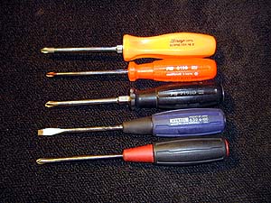 余談になるが、ドライバは同じメーカの同じシリーズで揃えると全部同じ形の同じ色になりやすい。並べた時には綺麗で壮観なのだが、何が何だかさっぱり解からなくなる。こうなると目的のドライバを手に取る時に悩む(笑)。目的に応じて適材適所で多数のメーカから選ぶと、悩まずに一発で目的のドライバを手に取る事が出来る。Snap-onならカラフルなグリップをいろいろと選べるので、サイズやプラスマイナスに応じて色を分けると良いだろう。 私がいろいろなメーカのドライバを持っているのは、目的を明確に分けて使用しているからである。車載用、叩き用、本気フルパワー用、etc...。このような分類は本人にしか解からないもので、多かれ少なかれそのような分類をやっているメカニックは多い筈。これはドライバに限った話では無い。 だから工具の貸し借りってのはお互いにとても嫌なモノなのだ。 皆さんがどこかのショップや工場で工具を借りる機会が有った場合、細心の注意で使用してもらいたい。 貸す方はニコニコしてても本当は嫌なのは間違い無いのだから。