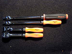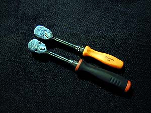一番上から、デカゴムグリップを付けたFH12LO改、デフォルトのFH12LO、でかゴムグリップを外してオレンジグリップを付けた新型FH936、旧型F836、である。ブレイカーバーに巨大グリップ、ラチェットに小振りなグリップ、これぞ本来の正しい姿だと思うんだけど。やっぱSnap-onはナニかを間違えたとしか思えん(笑)。グリップを交換したFH936とF836はほぼ同じ使い心地。デカグリップを付けたブレイカーバーはすっごく使いやすい。こりゃ良いぞ!このカタチで販売するべきだと思うんだけどなぁ。