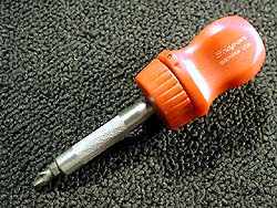 私の超お気に入り工具なのだ。Snap-onのラチェッティングドライバと言うとフルサイズのモノを買う人が多いのだが、私が買ったのは小型なヤツ。ラチェッティングドライバは細かいところとか比較的軽いネジをチャカチャカと小気味良く回したい。内装をバラす時とかには最適。そんな用途なら小型なモノで手の平に収まるサイズの方が使いやすいのだ。フルサイズのドライバならシャフトを指でくるくる回せば素早く回せるのでラチェットになってなくても良いし。でね、この小型なヤツがすっごく使えるし細かなラチェットの動きなんか実に素晴らしいのよ。