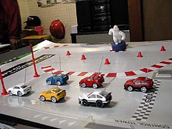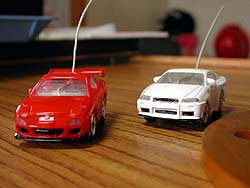 で、2.2モータ付きのR34やS2000などは速すぎてコントロール不能(^^;。スピードにステアリングレスポンスが追い付かないのだ。S字コーナなんか曲がりきれん。ハイパワー過ぎてコースを走るとマトモに走れないのよ。FD3Sに付いてくるローパワー1.0モータだとステアリング操作が間に合うのでちゃんとコースをトレースできる。結果的にはちゃんと走れる1.0モータの方が楽しい。ナニも無いところを自由に走るなら2.2モータの方が速くて面白いんだけど、パイロンを立てたりコースを作ったりすると1.0モータの方がライン取りまで考えてコントロールできるんで面白い。