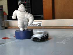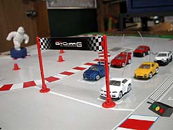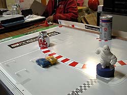 サイドバイサイドの激しいバトルでMACソケットコーナへ突っ込むR34とFD3S。その先のワコーズS字コーナから最終コーナまでをいかに直線的なライン取りで走るかが決め手。熱いバトルがマジでテーブルの上で繰り広げられる。メッチャ楽しいんだけど、いろいろとトラブルも発生する。それは次のページで。