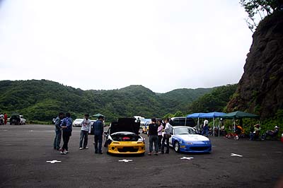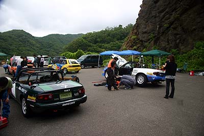 参戦以来、初めて表彰台を逃した悔しさと、ピットインが1回多いというハンデの辛さ、ハンデを抱えたロドスタ勢では最速だったという誇り、スタレットにすら勝てないレギュレーション(ハンデの件)への怒り、いろいろなモノを噛み締めながら、1号ドライバ3名は誰もいなくなった間瀬のパドックでひたすら反省会を続ける。ナゼかと言うと、積載車が帰ってこないから撤収できないの(^^;;;;;