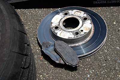 Tカーからフロントブレーキロータとキャリパを移植、ブレーキパッドを交換。リヤブレーキパッドも交換。ナニが起きたのか?