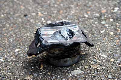 ブレーキパッドが燃え尽き、パッドの裏金とピストンが溶接状態で一体化。圧延材が溶けたわけで、1500度を超えたのでは? だから1本目でブレーキから煙が出てるって言ったじゃんっっ!(笑)