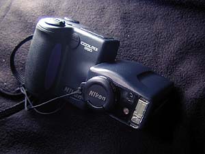 ネジコンみたいな回転式レンズのE990だ。やっぱしスマートメディアがどうしても嫌で、最終的にはCFカードのカメラしか考えなかった。こいつの新型のE995は電池が専用充電式電池になってしまったので論外。単三電池が使える旧型E990の在庫処分品を叩きに叩いて買った。E950の在庫品も有ってかなり安かったんだけど、コマンドダイヤルの使い難さとかAFの遅さや電源オンで望遠側にズームしちゃうのが気に食わなくてパス。で、総合的にはE990の満足度は95%くらいかな。広角側が28mm相当なら文句無しの100点を付けられるんだけどねぇ。E700で問題だった低輝度でのAF不良はE990では問題無く、E700の限界より2EVほど暗い所でもAF可能だ。5点測距のマルチエリアAFも優秀だし使いやすい。オートホワイトバランスはかなり優秀で、256分割マルチオートホワイトバランスとかなんとか。どんな光源でもそこそこ普通の色で写ってくれるので、E700のようにいちいちホワイトバランスをマニュアル設定する必要はほとんど無い。片手で露出補正や撮影モード変更が可能、操作性に優れた専用ボタンで画像サイズと圧縮率を別々に設定可能、ISO感度、マニュアルフォーカス、なども専用ボタンが有るのでメニューを呼び出す事無く瞬時に設定可能だ。記録画像サイズに銀塩フィルムと同じ3:2のアスペクト比で2048X1360というのが選べるのも良い。1600X1200の200万画素サイズで記録できないのはちょっと残念。