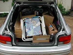 そしてイベントは終了し、荷物を撤収する。残った商品をインプレッサバンに積むわけだが、来た時よりは減ってるハズと思ったら、なぜか増えてる...。売れて減った分もあるんだけど、それ以上に巨大なモンを買ったのね(^^;。それ、やっぱし俺のインプレッサバンに積むのかい?