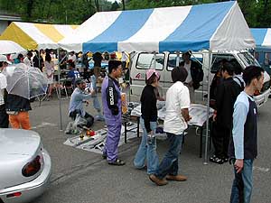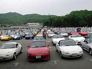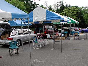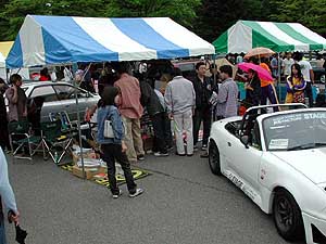 1300人、750台のロドスタが集結したらしい。38mm相当のレンズでは会場全体は画面に入り切らない。実際の会場はこの倍くらいの幅がロドスタで埋まってる。でも毎年台数が増えてるような気がするなぁ。各所でゲリラ的フリーマーケットなどが開催されているのだが、ヤフオクの影響か?今年はフリーマーケットは盛り上がりに欠けてた。各ショップが持ち込む中古パーツも少なかったし。去年はFire号が堂堕自動車のデモカーになって展示されていたのだが、今年はFire号は参加せず。