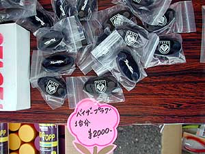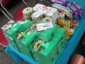 ABITブースで発見したウワサのサイ猿の山! 軸付きサイ猿! メタルコンパウンド! ...が、ヒッソリと積まれていたので気付いた人は少ない(笑)。 ミッションのオイルフィラー専用レンチなんかちゃんと紹介すれば売れると思うんだけど、なぜか隅っこにコソっと置いて有るだけだった。ABIT氏は商品を並べたらあとは遊んでるだけみたいだったので、商売っていうよりは単なるお祭りモードだと思われる(笑)。