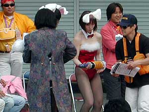 12倍ズームで460mm相当の撮影。バニーガールから賞品の車高調キットをもらう参加者。このバニーガールって毎年いるけど、いつも同じヒトなんだろうか? だとしたら年々品質が下がって10年も経つと...(笑)そうそう、去年はキックボードでダウンヒルをやって血まみれになったヒトがいたが、今年はキックボードなどの車輪モノは会場内で禁止となっていた。毎年レギュレーションんが厳しくなってるなぁ。今年はエンジン始動&カラ吹かしもイカンのだとか。ま、暴走集会じゃないんだから当然なんだけど。そーいえば何年か前はジムカーナもやってたんだけどなぁ。