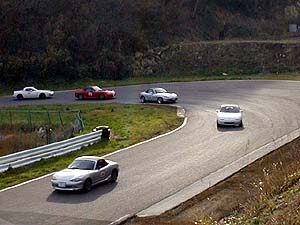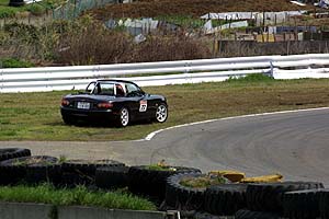 スタートはグリッドスタートでシグナル式。シグナルブルーとほぼ同時に5000回転ミートのスーパー半クラッチスタートを決める。クラッチが減ろうがなんだろうがスタートで速い86軍団に付いて行かねばならんのだっ。...ところが、ぶばぁぁぁぁ〜んって回転だけ上がって前に進まない。やばいっクラッチがブッ飛んだか?! と、思ったら音も無くジャダーも無く虚しく激しくホイールスピンしていただけだった。スロットルを戻したらトラクションが掛かったのだが、3000回転までストール、クロスミッションゆえのハイギヤードな1速で加速出来ず、左右からミサイル86がバンバン抜いて行く(^^;;;。5台くらい抜かれたか? ミラーなんか見る余裕も無いし左右に30cmくらいの間隔でミサイル86に挟まれて車線変更も出来ず、ただひたすらコースの真ん中をシケインに向かってヘロヘロと加速するしかなかった。ブレーキング競争でミサイル86と張り合う気にもなれず、1歩引いた私のイン側にホーリー氏の真っ赤なロドスタが飛び込んで来た。イカン、ホーリー氏にまで先に行かれたっ。大失敗のスタートであった。