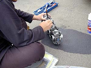 溶接した後でABIT氏が自分で潜って、万が一溶接部が折れた場合でもジャンプしなようにワイヤで縛る。路上整備である(笑)。軽く試乗してみると、どうやらパワーは見違えるほど甦ったようだ。ニッコニコ顔で生体エネルギーを取り戻し魂が帰ってきたABIT氏。原因がFreedomのセッティングやバルタイ、エンジン本体などではなかった事に気を良くしたABIT氏はこの後も元気いっぱいだった(笑)。
