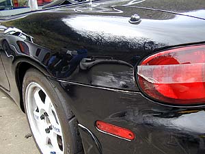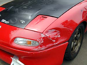 ミサイルホーリー号のレース後の姿。左フロントフェンダで86にインから突っ込み、86がスピンしながらホーリー号の右側に回り込み、右側全体に擦った。合掌...ABIT号はレース中にノーマルエンジンのNA8Cにまでストレートでブチ抜かれ、もはや完全幽体離脱状態。線香を上げたくなるほどだ。どうしたんだABIT...?