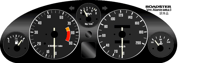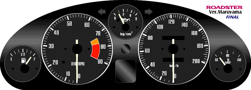 ↑私の希望を大幅に取りいれて出羽さんがデザインし直してくれたもの。素晴らしく高速にやり直してくれたので燃料計のフォントが直してないようだが全体の雰囲気は最高レベルだと私は思う。水温と燃料の目盛りは細かくなっているので良いが油温計の目盛りも細かいのが欲しい。フォントはもう少し小さい方が繊細な感じで良いと思う。水温油圧燃料のメーターは文字ではなくて純正と同じマークを入れてもらった。私はこの方が好きだ。