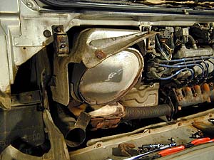 マフラ上側の大きなカバーは、本来は外さねばならんのだと思うが、これを外すと余計な被害と手間が発生する。サクっと切ってバキっと曲げてマフラをよけた(^^;