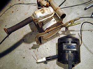 解体屋でWordとWindowsNTの講習をやってもらって来たマフラ。サンバのマフラは遮熱版が外れてビビる事が多々有るので、先に溶接補強してしまう。このマフラに付いてきたサーモフューズは配線がブッチ切れてた。私のに元々付いてたのはすでに融けてる。サーモフューズは買うと高いので、そのまま切れたモノを付けておく。そうするとメータの警告灯が点きっパになるわけで、うっとぉしいのでサーモフューズ配線をアースに落とした(笑)。